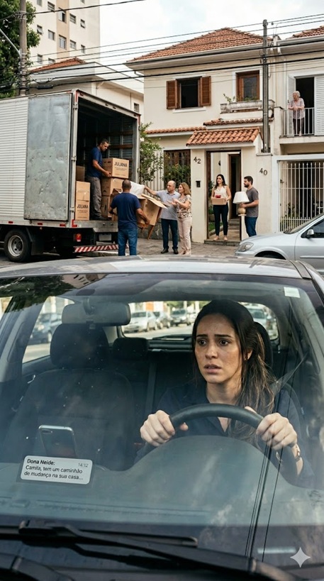 “14h12, minha vizinha mandou: ‘Tem um caminhão de mudança na sua casa em São Paulo’ — só que eu nunca planejei sair… Quando cheguei, minha própria família já estava se instalando como se fosse dona.”