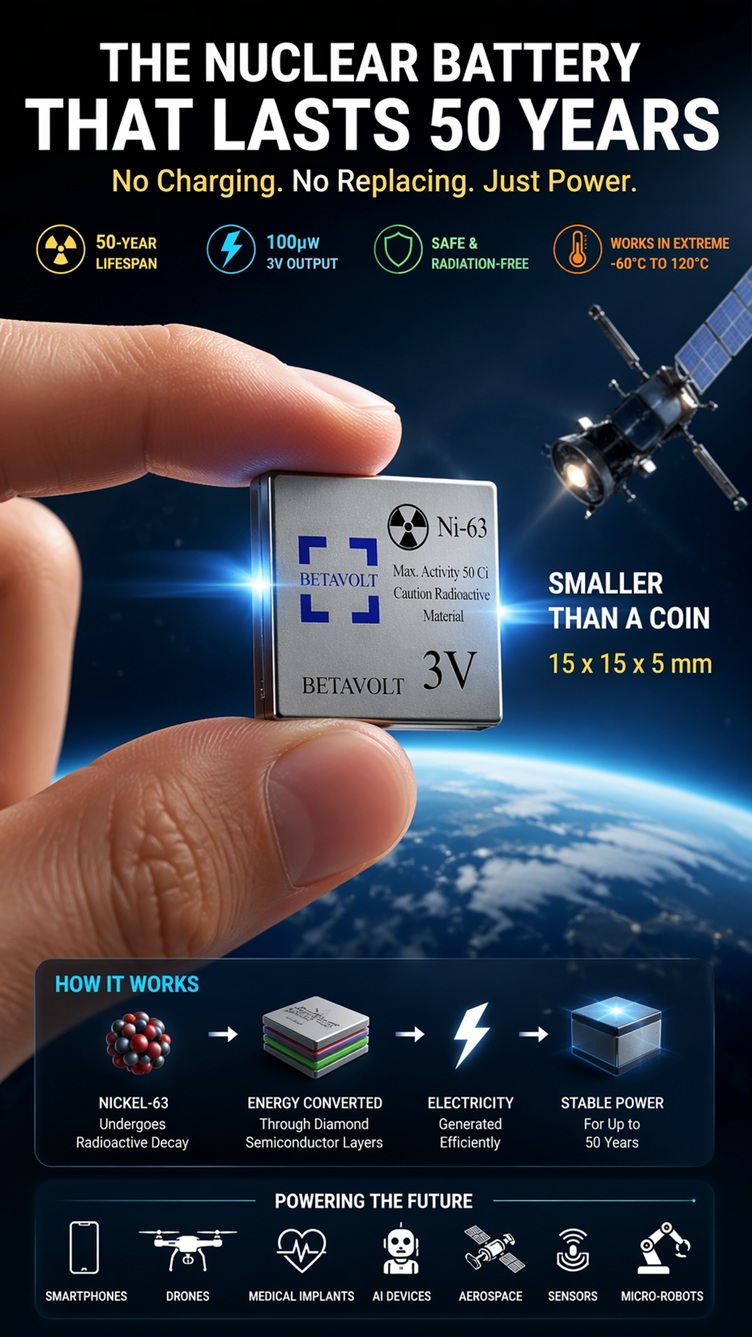 A Chinese startup, Betavolt Technology, claims it has developed an ultra-compact nuclear battery smaller than a coin—capable of powering devices for up to 50 years without recharging.