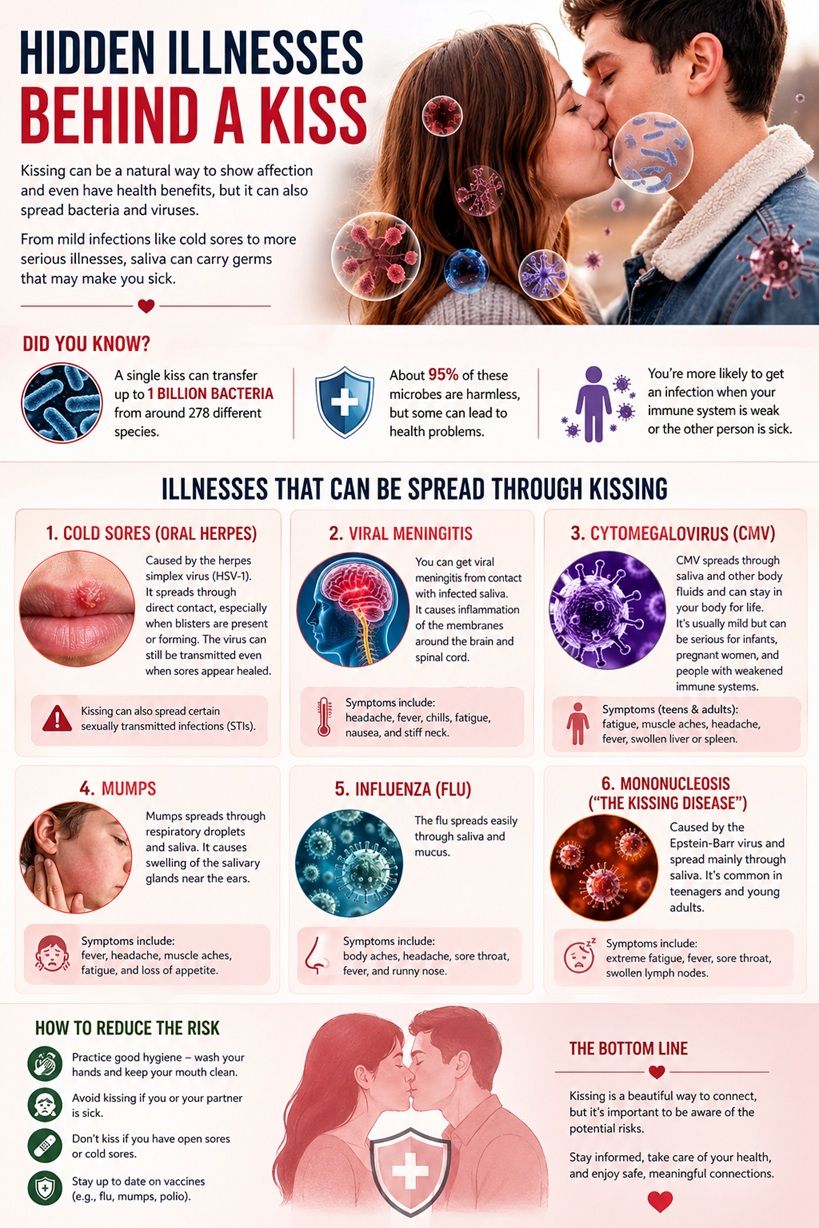 A kiss might seem harmless—even healthy—but it can also be a pathway for transmitting infections. From relatively mild conditions like cold sores to more serious illnesses such as viral meningitis or mumps, saliva can carry a range of viruses and bacteria.