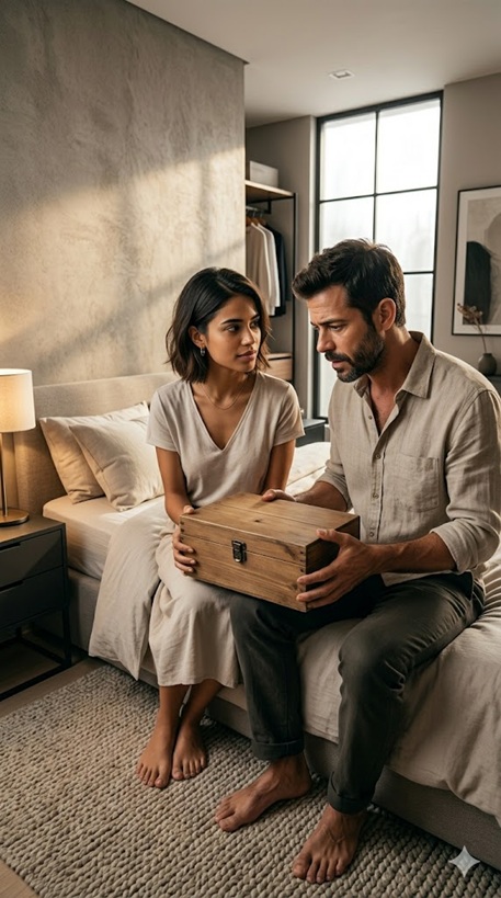 O quarto pequeno era iluminado por uma luz amarela fraca. O clima era estranho — uma mistura de vergonha e tensão.