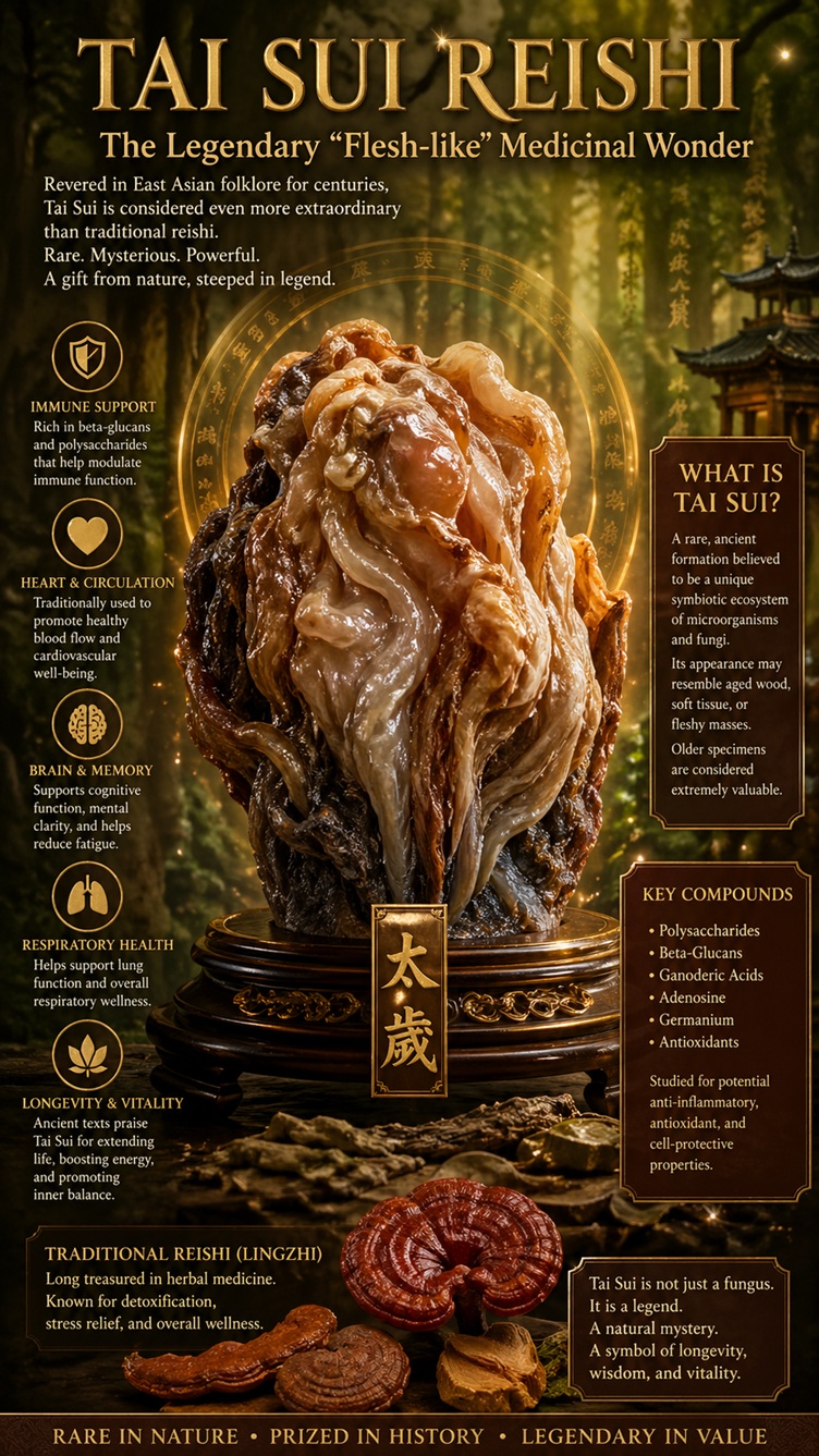 “Tai Sui Reishi” (often referred to in folklore as a rare “flesh-like” medicinal fungus) is considered even more extraordinary than traditional reishi in many East Asian legends, though modern scientific classification remains debated.
